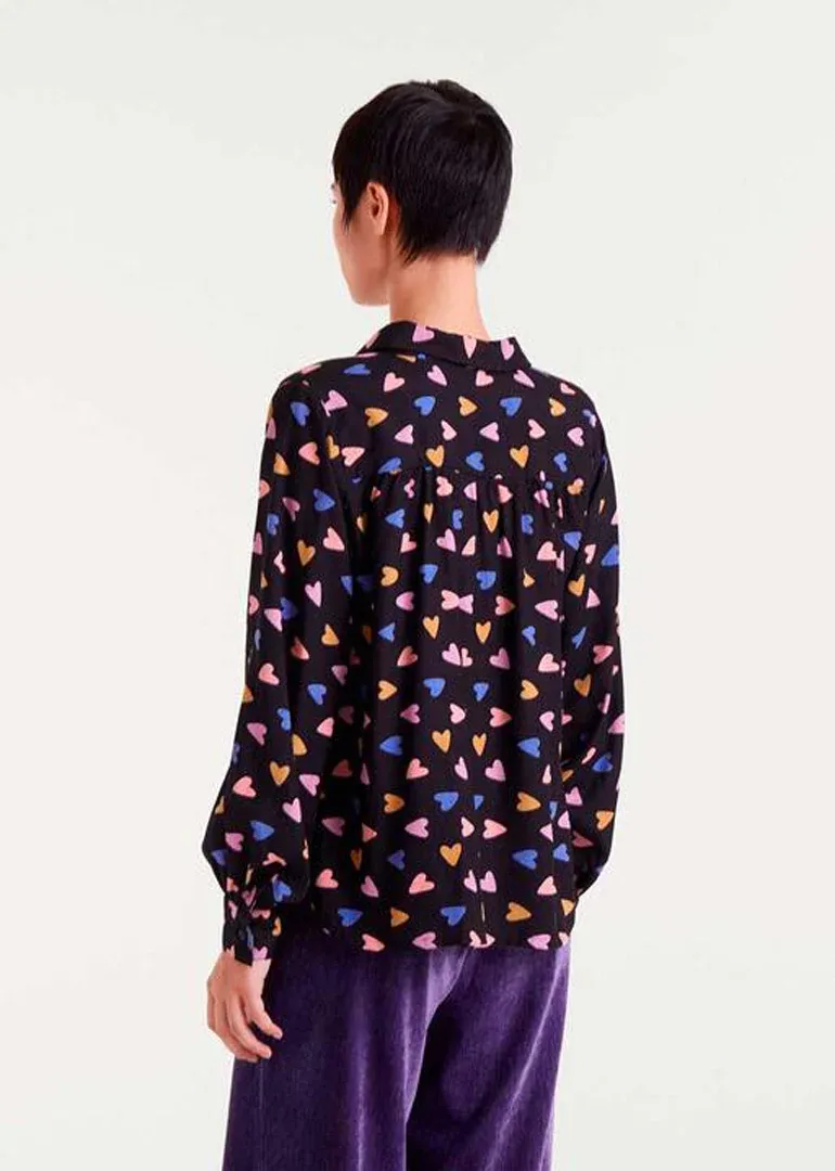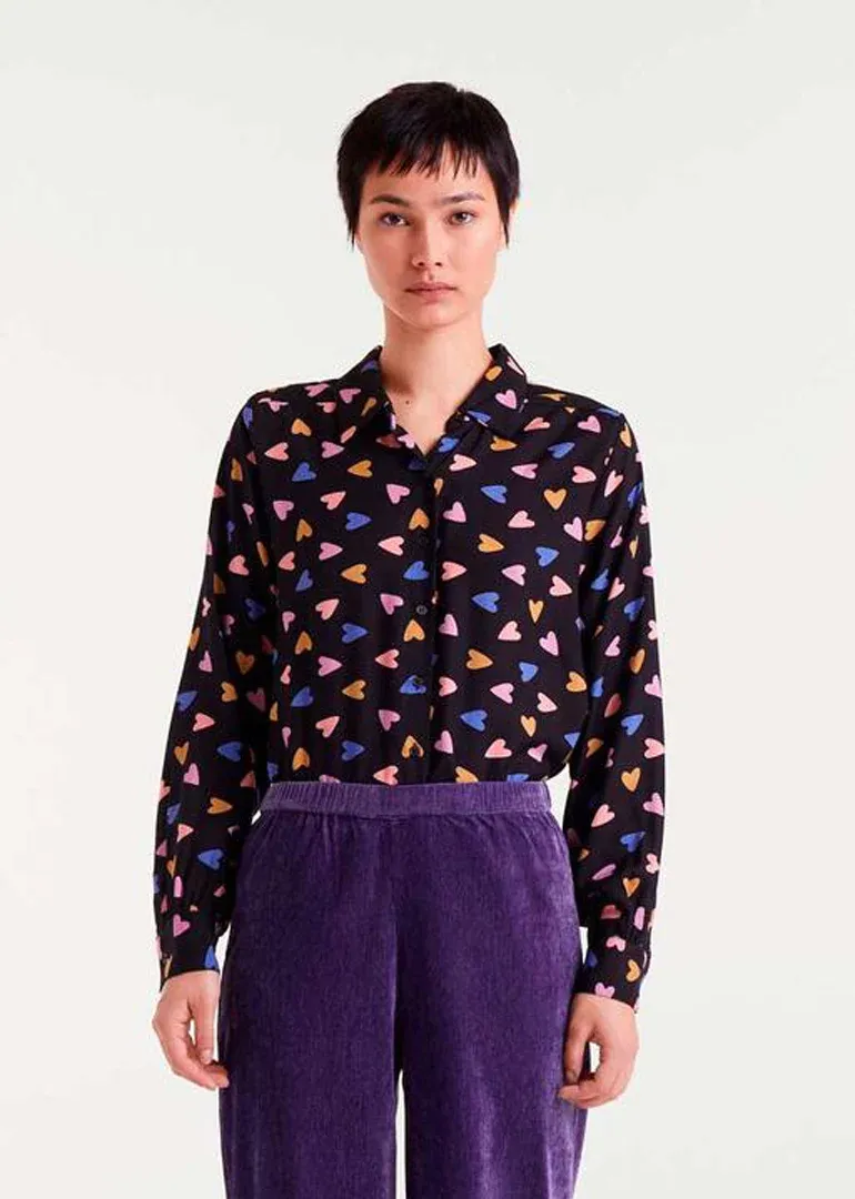 Camisa  estampada de corazones multicolor sobre fondo negro