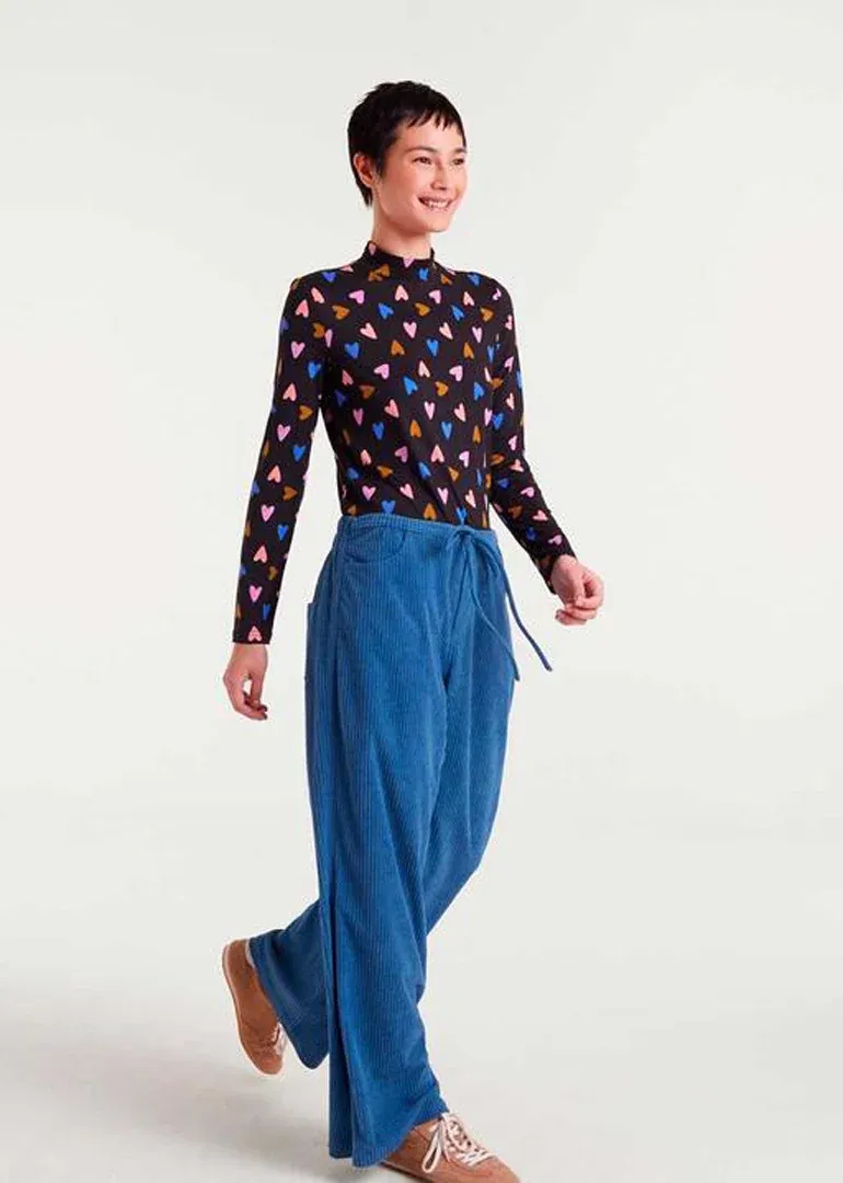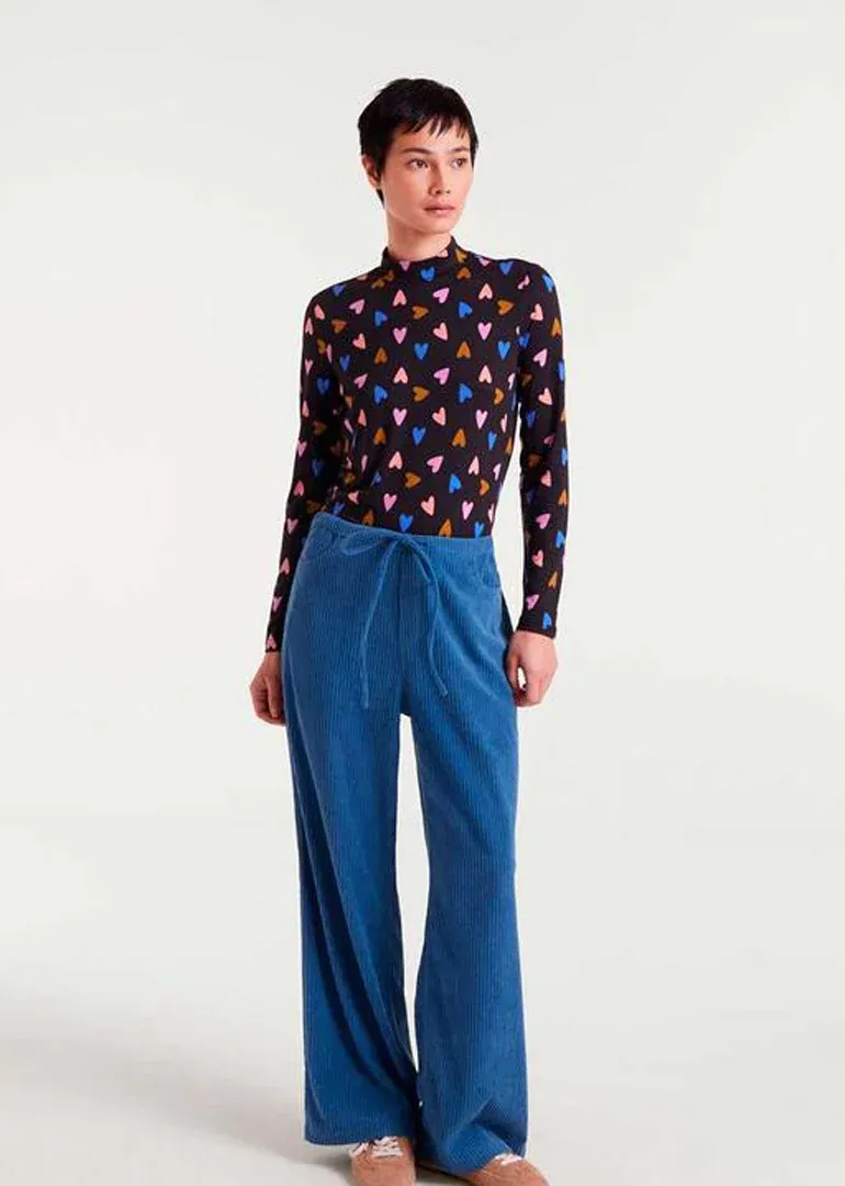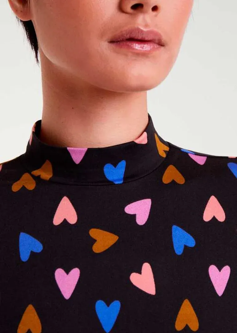 Camiseta básica con cuello alto y manga larga con estampado de corazones multicolor sobre fondo negro.