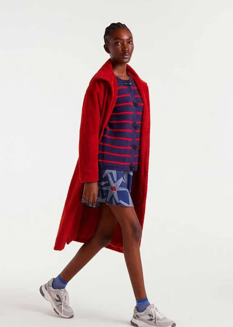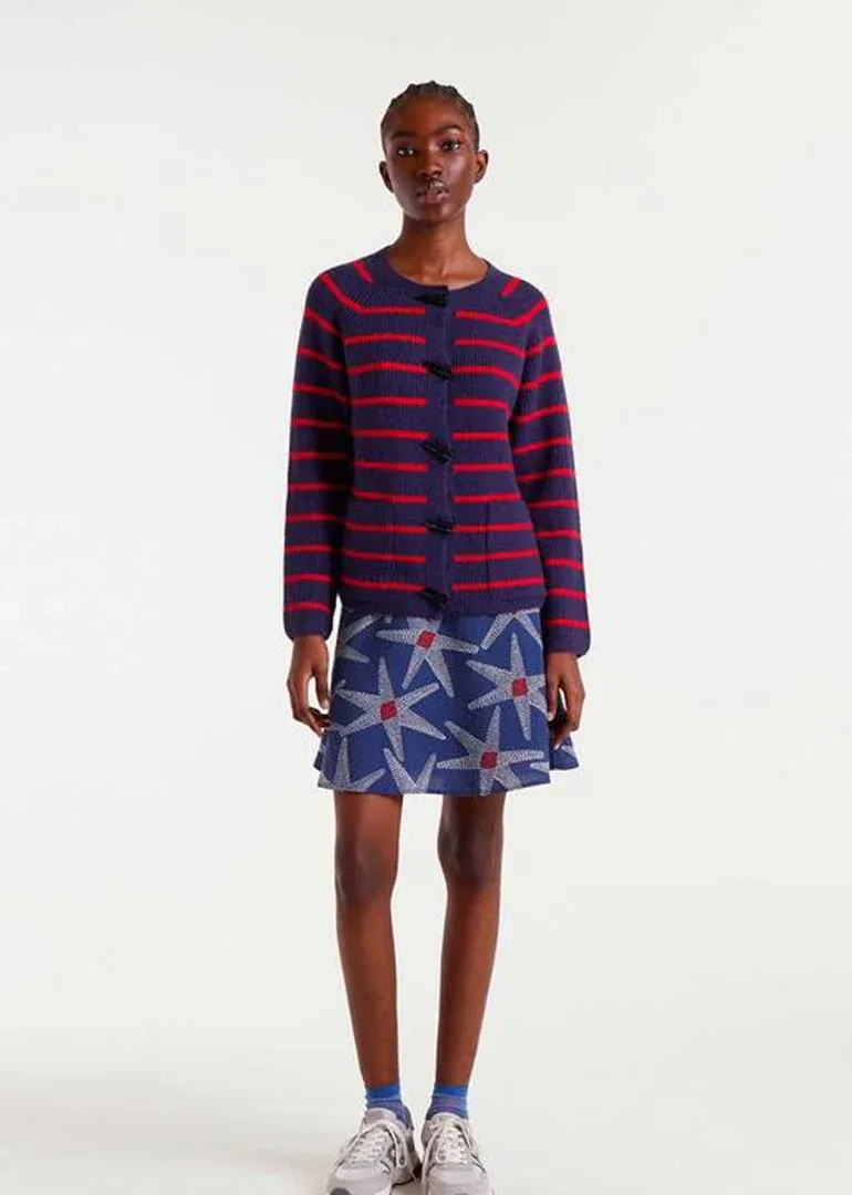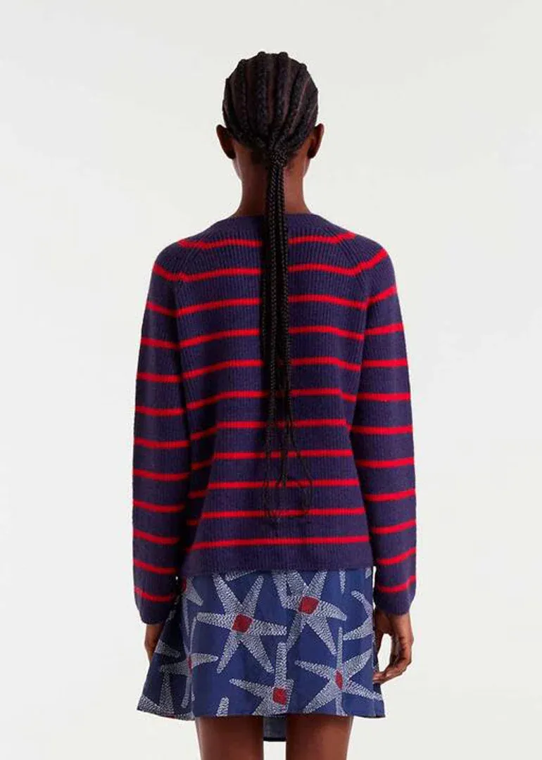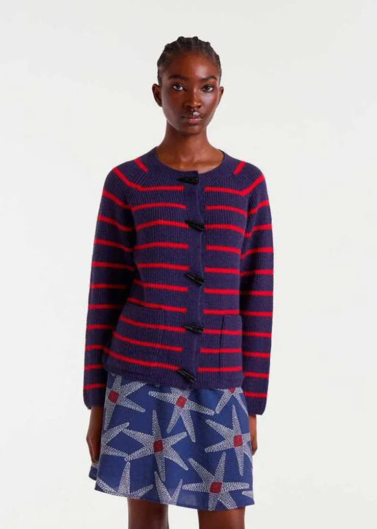 Cárdigan de punto a rayas en tonos rojo y marino.