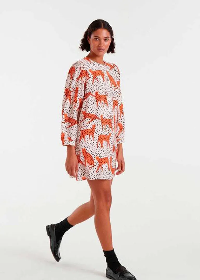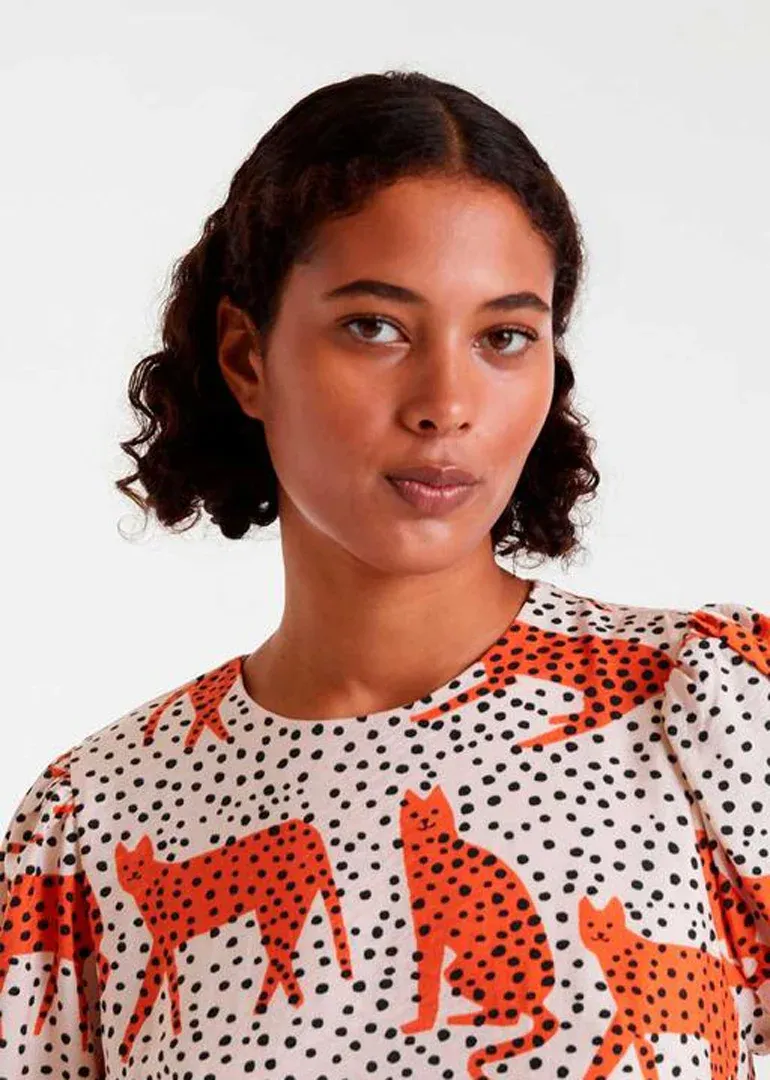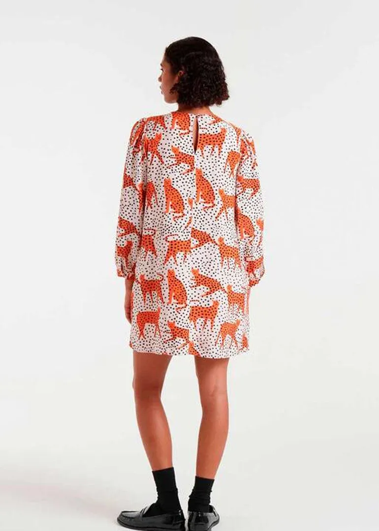 Vestido corto de crepe ligero con estampado Tano: topitos negros sobre gatos naranjas y fondo beige.